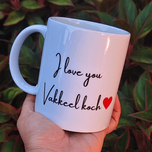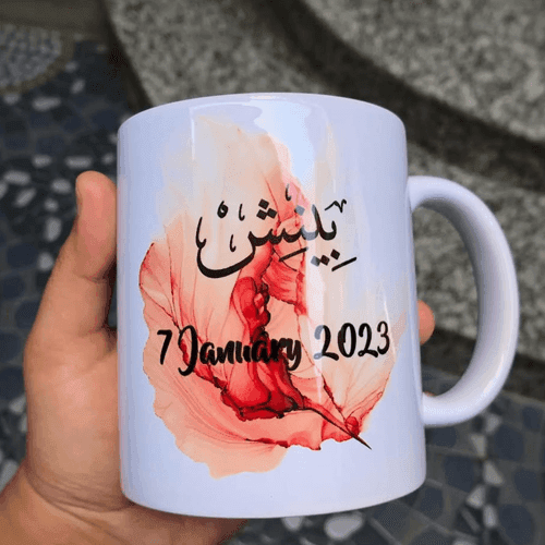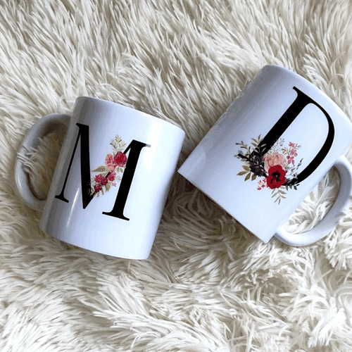 • White ceramic mugs with vibrant inner colors and matching handles.